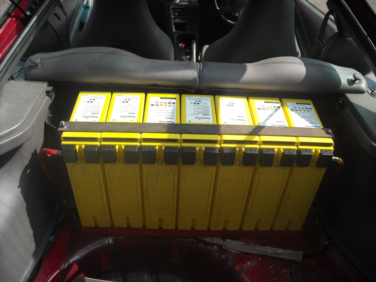 I have had a suspect battery on charge for 3 days now to get it up to the same level as the rest of the batteries on the car and after work I came home and put it on the car, then put the car on charge, so they can all charge up together. I am hoping this will get me some use for the coming week. My friend is progressing with the board layouts for the battery monitor display and then we shall be working through the sensing circuits and communications boards. My other friend is progressing with the fascia plate to mount this and the other switches on. It will either be chrome letters or a polished brass plate engraved and painted in with red. This will be on a shiny black background. This will be like putting the icing on the cake (for the interior). Meanwhile I keep phoning the battery salvage yard in the hope they will have some more bats I can do swaps with and squeezing the last few Ah of capacity out of the ones I have now. Hopefully I can win the lottery this week and get it kitted out with Lithium batteries. If I won the lottery I think I would get another Probe and convert it with a no compromise approach. The I would have a good looking hot car that could do 300 miles between charges. Dream on..... 87)